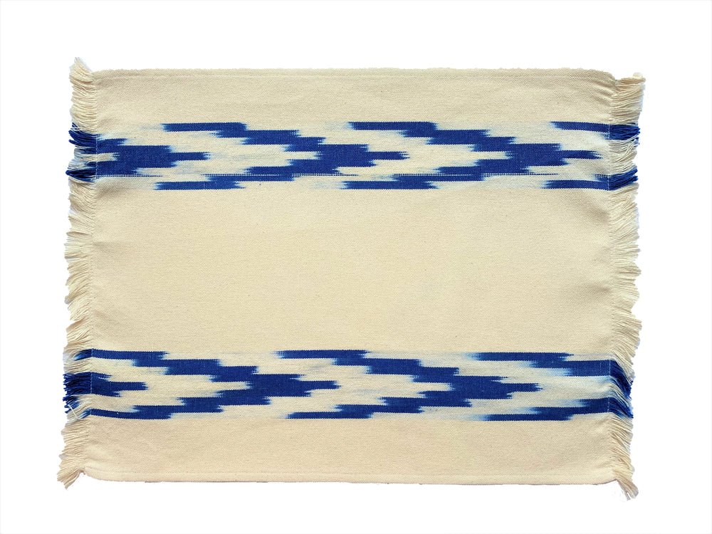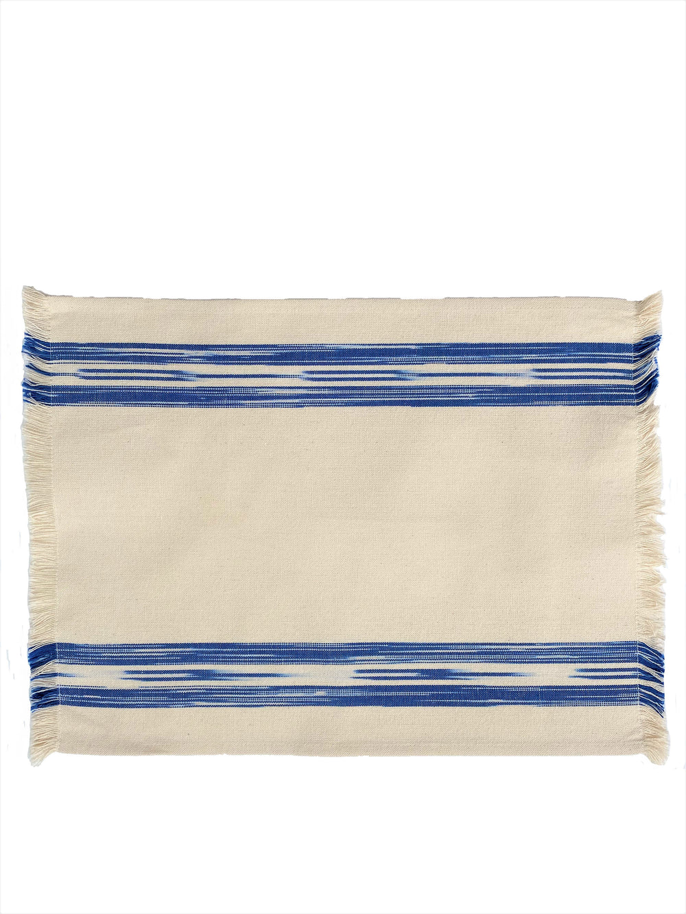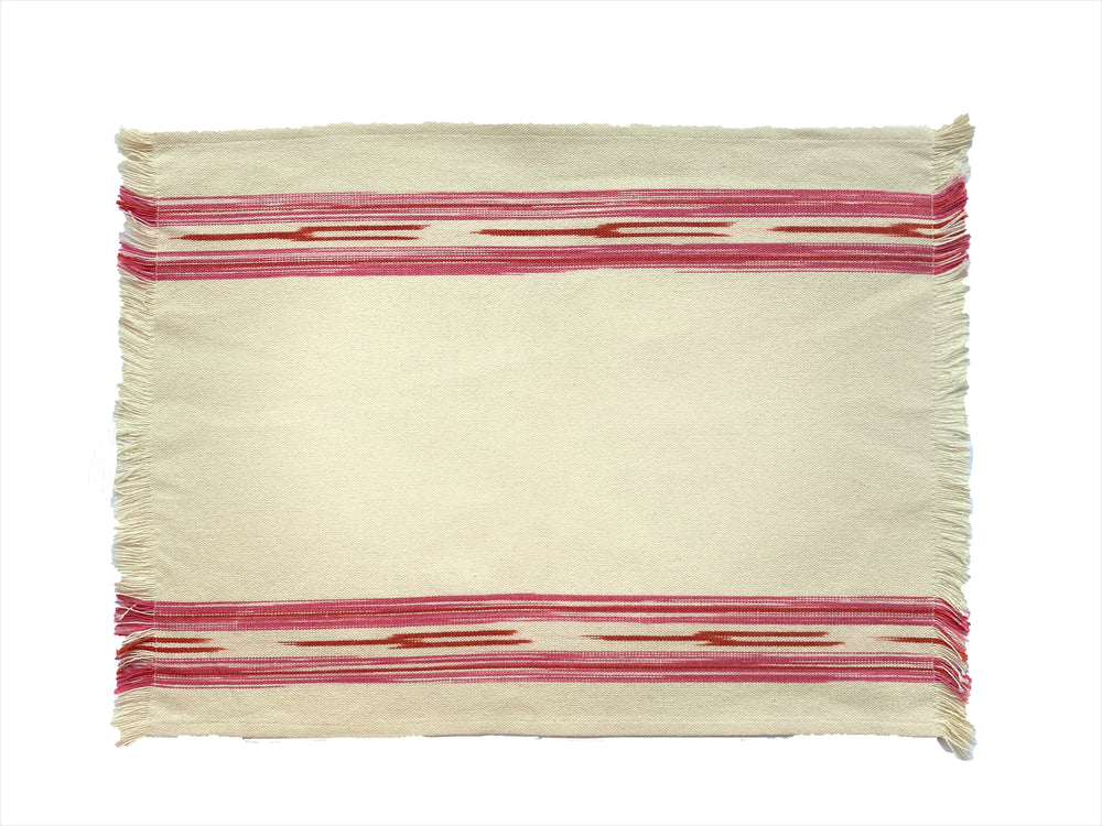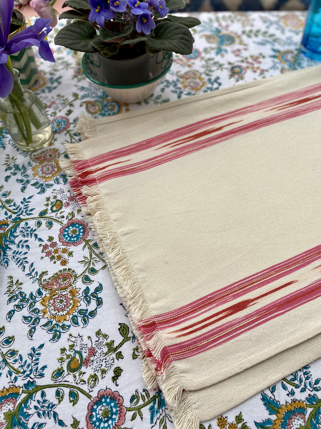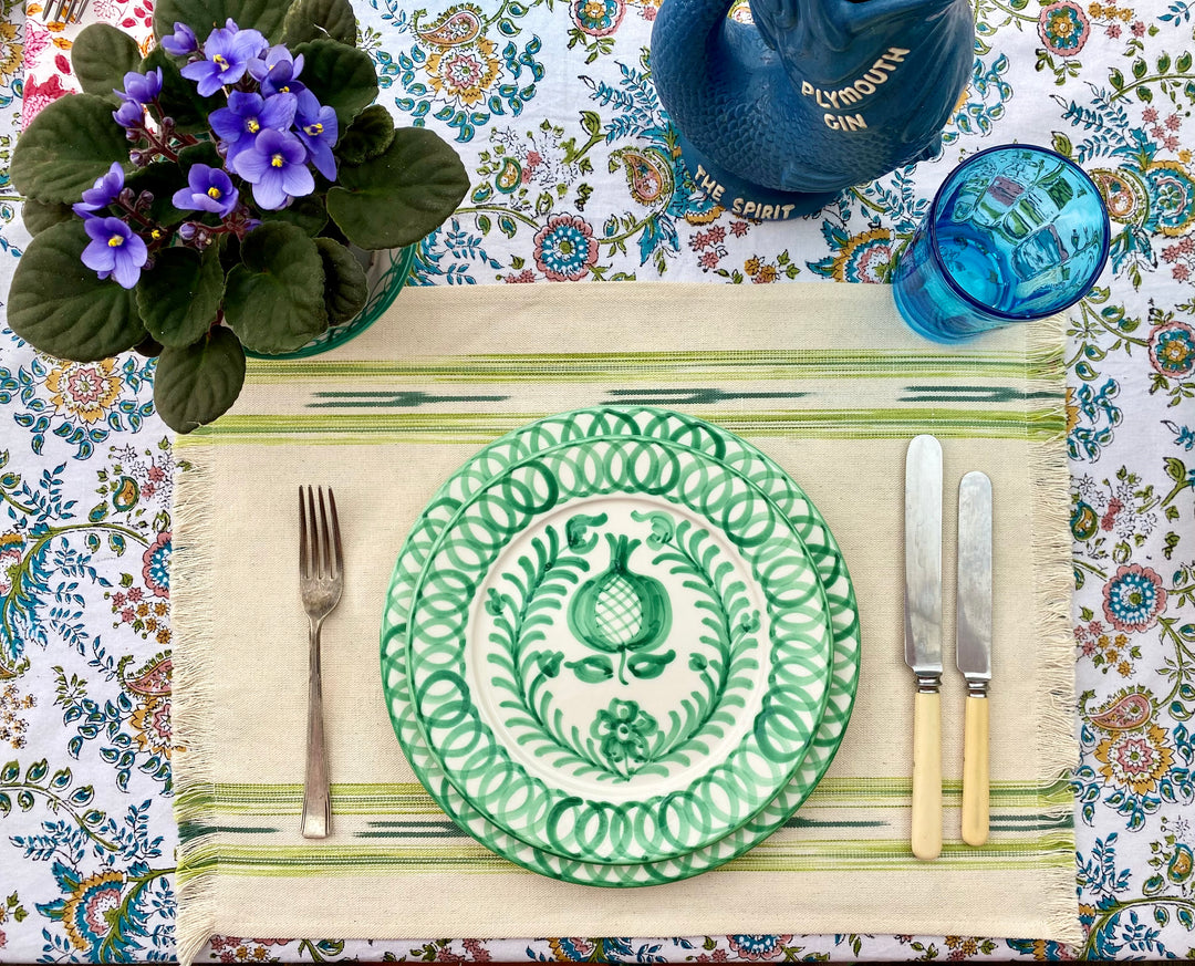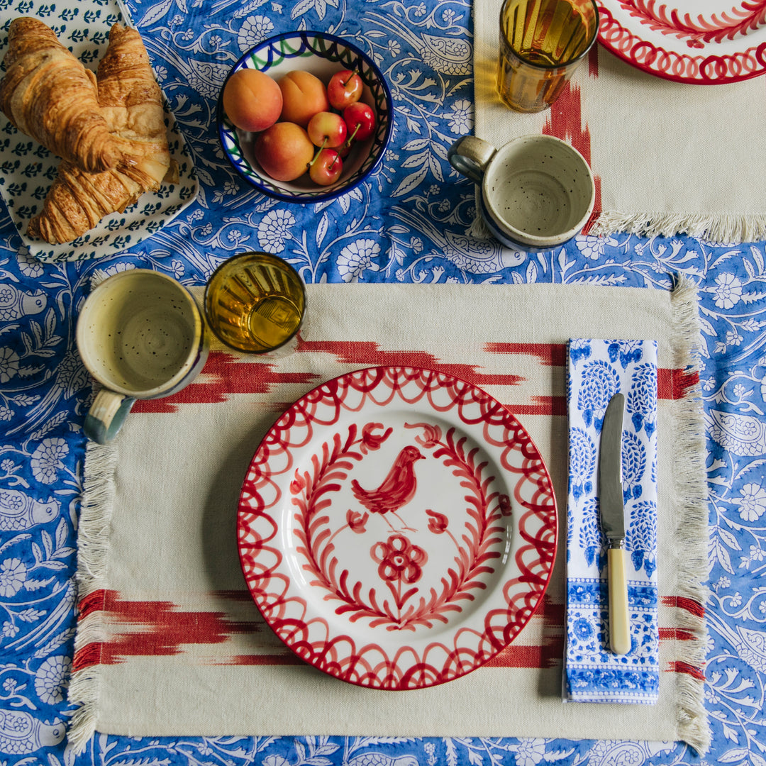 Beautiful rectangle fabric placemats from Mallorca and our fun bright Charger Plates.